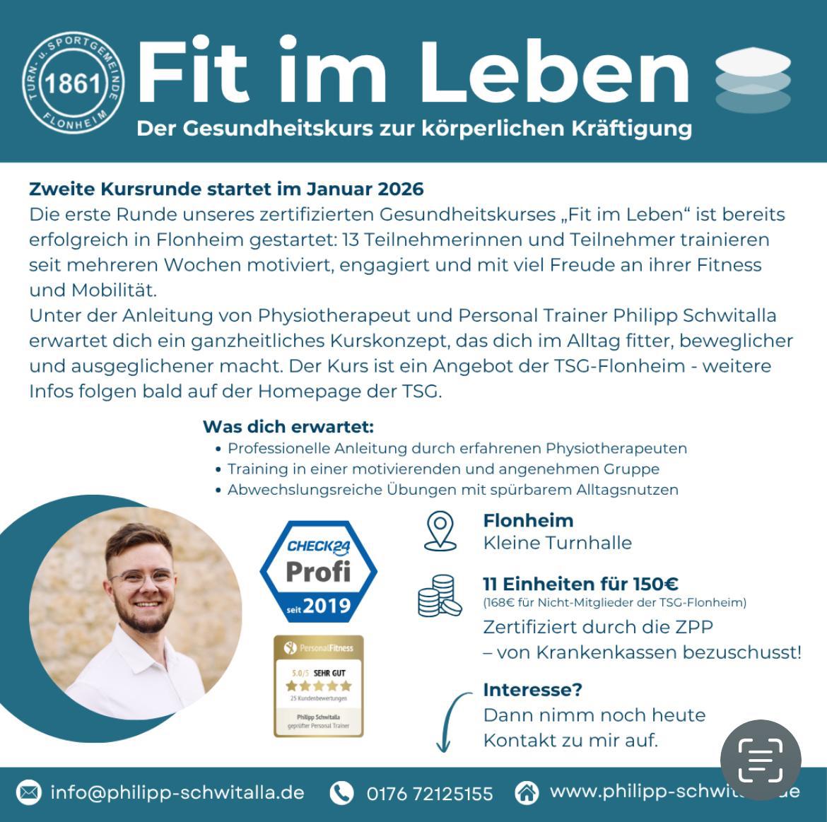 Als TSG freuen wir uns, unser Angebot um einen zertifizierten Gesundheitskurs zu erweitern. Die erste Runde von „Fit im Leben“ ist erfolgreich in Flonheim gestartet: Seit Oktober 2025 trainieren 13 Teilnehmerinnen und Teilnehmer motiviert, engagiert und mit viel Freude an ihrer Fitness und Mobilität.