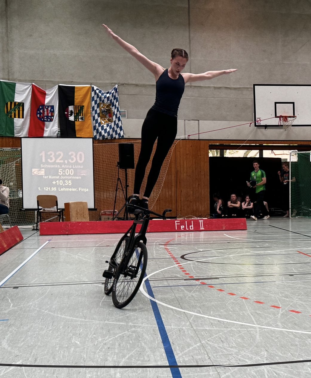 Am vergangenen Wochenende zeigte Anna, dass sie auch in dieser Saison zu den besten 1er Juniorinnen Deutschlands gehört. Trotz einer Verzögerung von 30 Minuten, chaotischen Verhältnissen beim Einfahren und einem Start direkt nach dem Radball behielt sie die Konzentration und präsentierte eine saubere Kür. Alle Übungen liefen rund und die Zuschauer hatten zu keinem Zeitpunkt das Gefühl, dass hier etwas schiefgehen könnte.