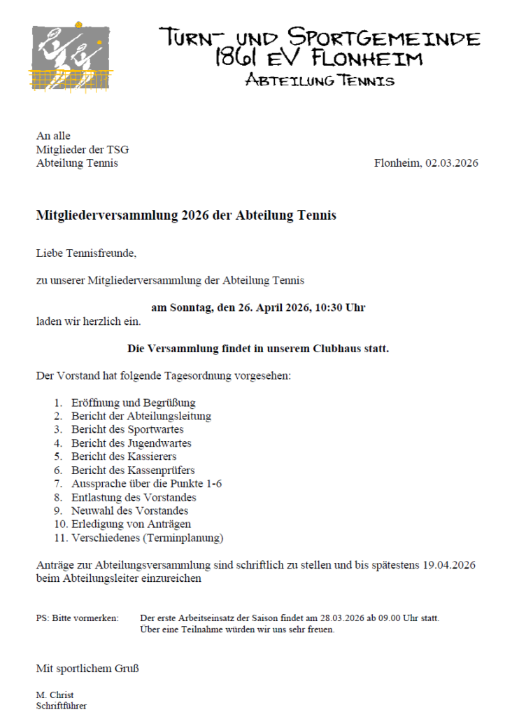 Start Tennis Mitgliederversammlung der Abteilung Tennis